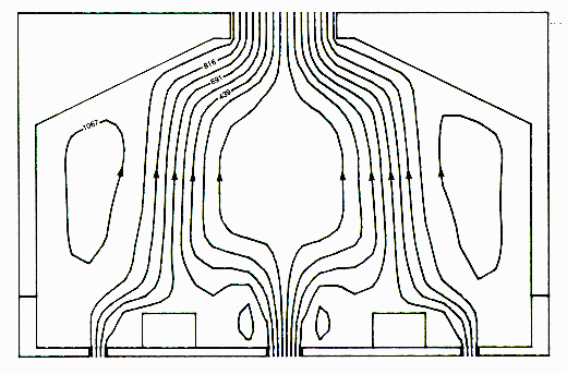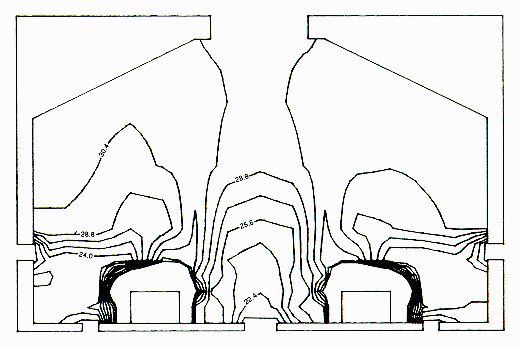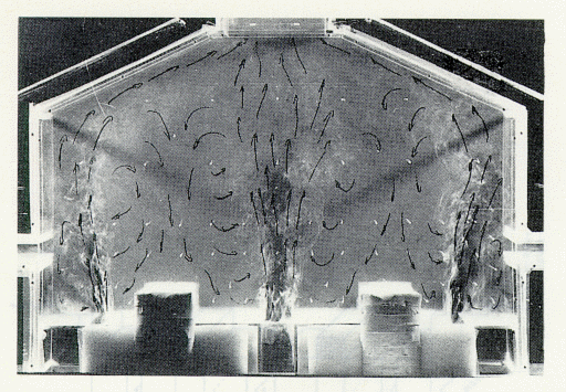 Les résultats expérimentaux sont montrés à la figure 2. Le profil d'écoulement, réalisé qualitativement à partir de d'observation directe des films de la maquette, est en bonne concordance avec les lignes de courant obtenues à partir des lectures de vitesse dans la maquette. Les deux interprétations de l'écoulement mettent en évidence les six boucles de recirculation et les courants descendants au-dessus de chaque cuve. L'écoulement au-dessus des entrées est non-stationnaire tandis que l'écoulement au-dessus des cuves est stationnaire. I1 faut cependant souligner que deux types d'écoulement ont pu être observés près des murs de la maquette. Le premier type, où les jets d'air des entrées latérales moment directement au plafond, a été observé pendant moins d'une heure après le départ de la convection forcée. Après cette période, l'écoulement se transforme irréversiblement et adopte le deuxième type où les jets latéraux s'inclinent vers les murs par l'effet Coanda. Trois simulations ont été réalisées avec le modèle mathématique soient: sans aucun modèle de turbulence, avec le modèle algébrique et avec le modèle K-e . La figure 3 montre les résultats calculés. Sans modèle de turbulence, les trois jets d'air provenant des entrées se dirigent directement au plafond et les recirculations au-dessus de chaque cuve sont asymétriques. Le modèle algébrique a amélioré les résultants légèrement et le modèle K-e a simulé presque le même écoulement que celui de la maquette. Une comparaison quantitative entre ces simulations est démontrée au tableau 1.