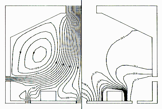Figure 5 - CAS 2: L'écoulement simulé (partie gauche) et les isothermes simulées (partie droite) a) aucun modèle de turbulence b) modèle algébrique de turbulence c) modèle K-e-G de turbulence Une modification a été apportée au modèle algébrique en ajoutant un terme pour la convection naturelle: