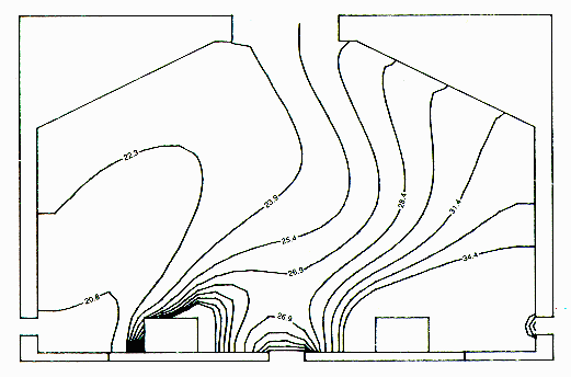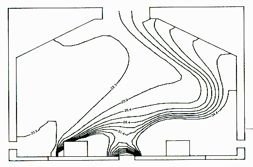 Cette simulation a permis de reproduire les six boucles de recirculation, mais les boucles près des murs étaient toujours trop grandes. Donc, le modèle algébrique a simulé seulement l'écoulement expérimental le moins stable: ceci explique la haute somme des carrés des erreurs. Mais le modèle K-e a réussi à simuler l'effet Coanda et, par conséquence, a réduit la somme des carrés des erreurs. CAS 2: MURS FERMÉS ET CUVES CHAUDES