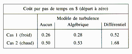 Si les calculs sont faits à partir d'une solution voisine, la différence entre les coûts des modèles de turbulence est réduite d'environ 50%. Étant donné que le coût d'utilisation du modèle différentiel est bien élevé, il semble plus avantageux présentement de faire des simulations industrielles sur des écoulements turbulents avec le modèle algébrique modifié. Même la modélisation de la turbulence par une viscosité constante peut fournir de bons résultats (Markatos et al., 1982). Plusieurs autres travaux de recherches seront nécessaires dans le but de trouver un modèle de turbulence efficace pour la convection mixte (Kurabuchi et Kusuda, 1987).
