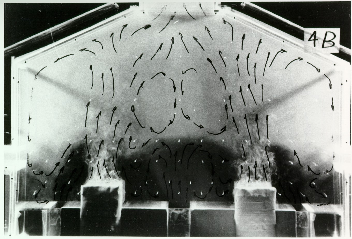 In this case the effect of wind was simulated by increasing the flow through the sidewall opening on the left side of the building model. The flow in the entire cell room was simulated, since the flow pattern was no longer symmetric with respect to the centerline. The experimental data showed that the thermal plume above the cell model on the left was flattened and the thermal plume above the cell model on the right was inclined towards the right (Figure 8). A large recirculating loop existed under the roof. The isotherms indicated a cool zone of 29 °C on the left side of the building and a warm zone of 34 °C on the right side of the building.