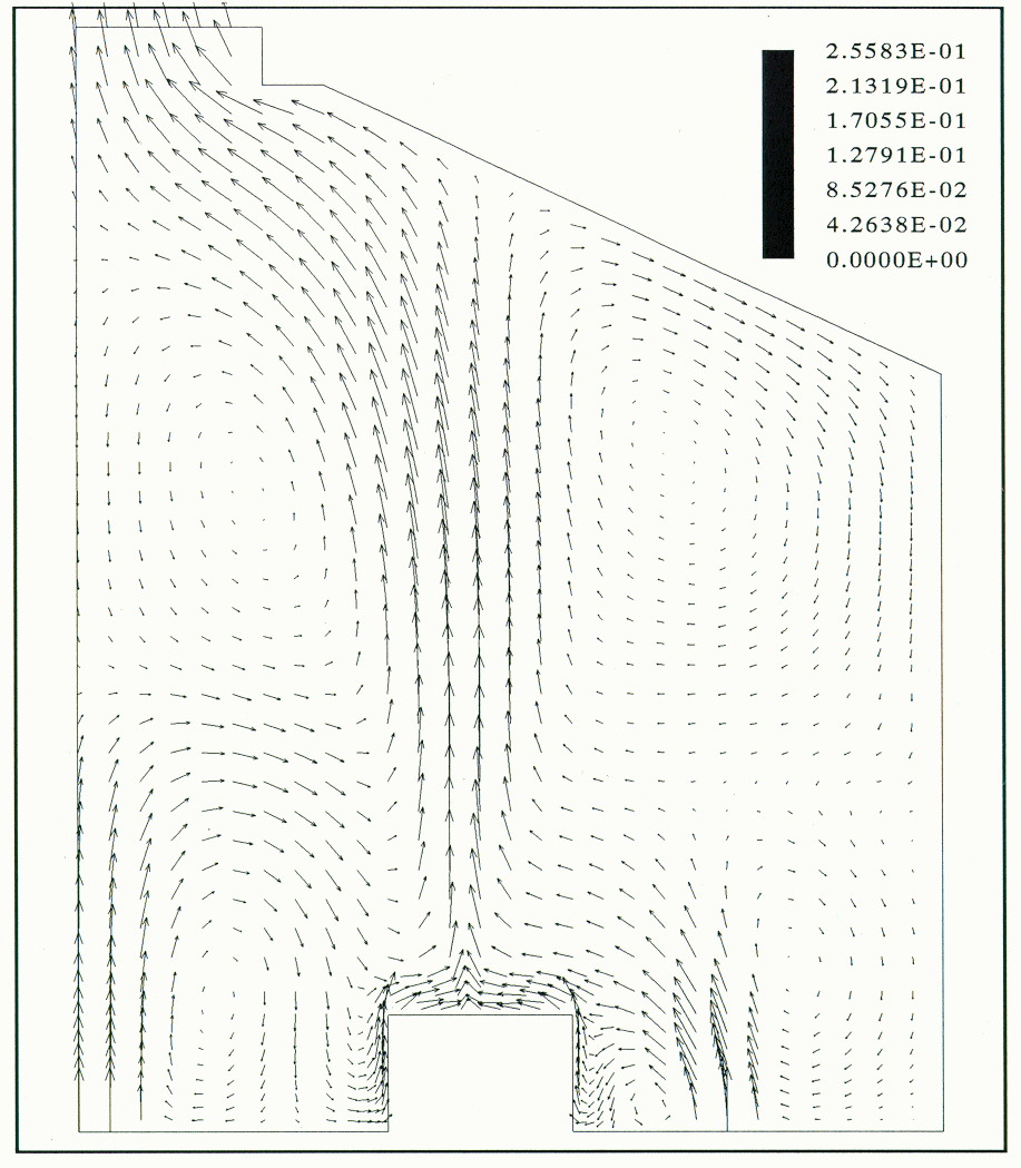 The Reynolds flux turbulence model also predicted the flow pattern fairly well (Figure 10). The isotherms showed a cool zone of 27 °C on the left and a warm zone of 34 °C on the right. The thermal plume above the cell model on the right was more effective than that of the K-E turbulence model. The temperatures near the floor were higher than those of the K-E turbulence model or those of the experimental data.