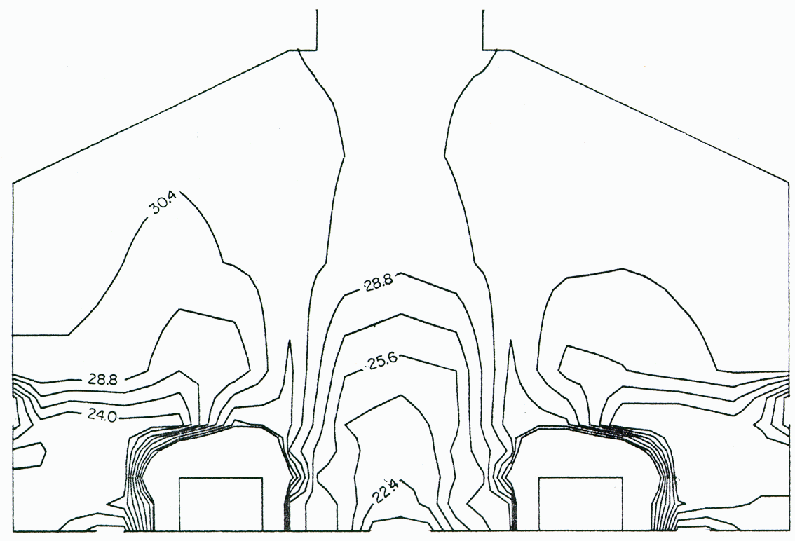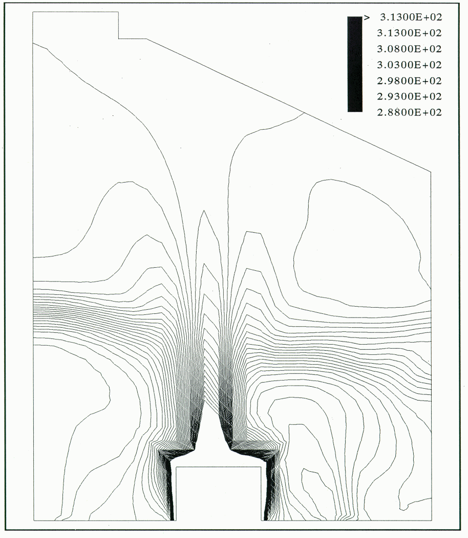 With the K-E turbulence model the flow pattern was similar to that observed in the physical model (Figure 6). However, the influence of the flow from the sidewall was overpredicted, since the thermal plume was pushed too much towards the center of the building. The isotherms show a narrow plume inclined at 45 ° and at a high temperature of 40 °C.