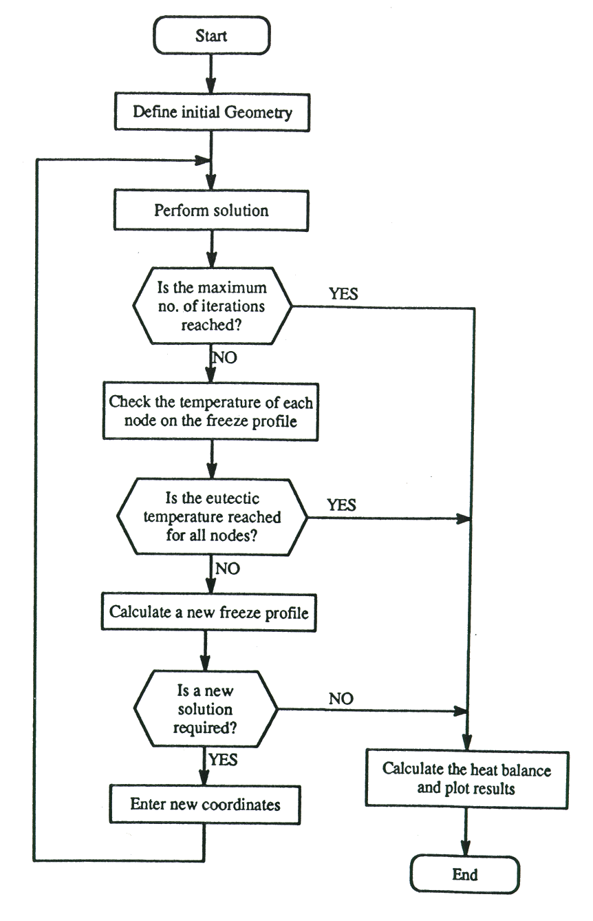 Parametric Looping Logic The calculation of the final freeze profile is an iterative procedure due to the non-linear aspects of the problem. The shape of the freeze profile is dependent on the surface temperature which in turn is dependent on the geometry of the model. The objective is to change the assumed geometry of the freeze profile such that all the nodes on the surface are within a prescribed tolerance of the melting temperature. This type of iterative looping is not part of the standard ANSYS non-linear capabilities. A customized solution logic was programmed using the ANSYS parametric design language (APDL). Figure 7 shows a flowchart of the looping logic as implemented in the model. Model Results Figure 8 shows a temperature contour plot of the converged solution for the three levels of model complexity and Table I presents the corresponding thermal summary. Ultimately, one is interested in the heat balance of the full cell. This can be calculated from the various models by appropriate scaling. |