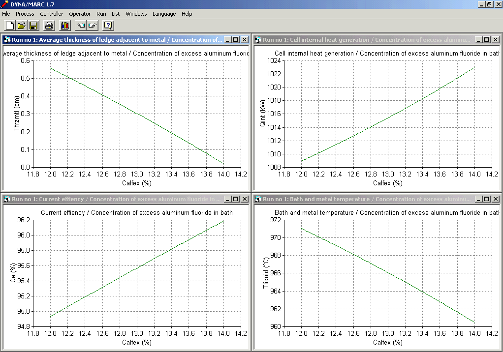 As described in [7], the lump parameters+ model has been recently upgraded by adding to it four new sub-models that computed the anode panel heat loss, the cathode bottom heat loss, the anode drop and the cathode drop. With the addition of these new sub-models, the lump parameters+ model also called Dyna/Marc 1.7 cell simulator [8] can be use stand-alone to do per example the thermo-electric design of a 500 kA cell starting from an existing design at 300 kA. Figure 1 and 2 respectively present Dyna/Marc 1.7 "What if" panel and the results of a trend analysis.