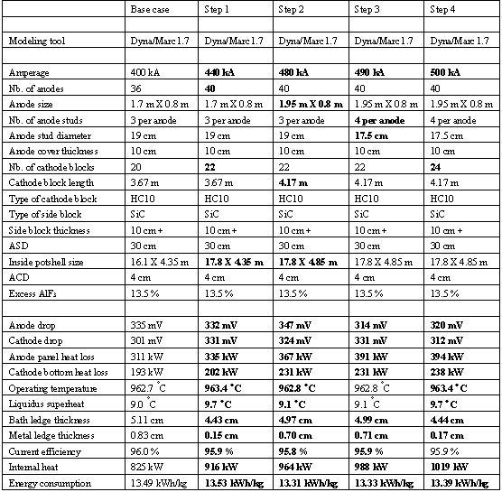 Now for the first time, a step-by-step study of the extension of this 400 kA cell into a 500 kA cell is presented. In total four changes were required to be able to push the amperage up to 500 kA, they are: