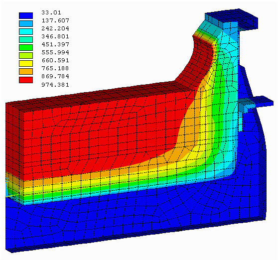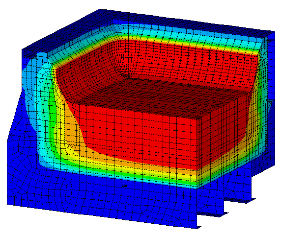 ANSYS-based 3D thermo-electric steady-state models are used to find a detailed lining design that is compatible with the selected internal heat generation (which mostly depends on the selected anode current density and anode to cathode distance). It will predict the detailed ledge profile (variation of the ledge thickness) that corresponds to the required steady-state cell superheat once the cell internal heat and lining insulation characteristics have been selected.