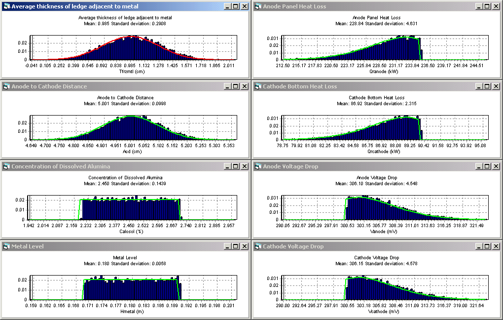 Later on, the Monte Carlo statistical tool of Dyna/Marc can be used to perform a risk assessment analysis [7] (see also Figure 7). As explained in [7], risk assessment analysis are important because no mathematical model is 100% accurate and often a 5% compound inaccuracy on the main models predictions (anode panel heat loss, anode voltage drop, cathode voltage drop, etc.) can translate into a 25% offset between the average thickness of the ledge at the metal level model prediction and the one measured in the prototype for example. Results of a risk assessment analysis can be used to justify the addition of a safety factor in the proposed design.