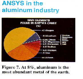 Aluminum is the most abundant metal of the earth. It makes up about 8% of the earth´s crust (Figure 7), third to oxygen and silicon. It weighs far less than other metal materials, resists corrosion, conducts heat and electricity, reflects light, and is non-magnetic. For over 20 years, major aluminum companies have used programs such as ANSYS to analyze and test their products. Aluminum is used in many different industries including aerospace, transportation, automotive, some electronics, and in many consumer products such as aluminum cans and baseball bats. The ANSYS program has many features developed or related to aluminum such as electric resistance heating, thermal-flow coupling, and magnetic capabilities. Analysis of aluminum reduction cells Alcan International, Ltd., is one of the world leaders in the production of aluminum and manufacturing of aluminum products. The company has been using the ANSYS program at its three research laboratories for over a decade. In particular, the Arvida |