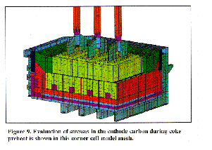 Figure 9 shows the evaluation of stresses in the cathode carbon during coke preheat. A sound preheat practice has a major effect on the life of the cathode lining. Large thermal gradients during coke preheat may crack the cathode blocks and render the cell inoperative. A good understanding of these gradients is required to minimize early failures. A transient thermo-electric model that calculated the temperature profile in a cell during a 36 hour preheat and thermal stress analysis to calculate the stress in the carbon blocks were developed. The parametric models allowed for evaluating modifications to the design as well as the operating procedures such as changing the coke bed layout, block geometry, material properties, and anode positions. A special algorithm was developed using APDL to optimize the transient time step which is controlled by the rate of temperature and voltage change in the cell. The algorithm was also used in the stress analysis to model the load transfer at the carbon-to-brick and brick-to-shell interfaces.