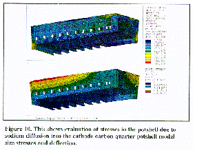 The evaluation of stresses in the potshell due to sodium diffusion into the cathode carbon is shown in Figure 10. Sodium ions present in the electrolyte of an aluminum reduction cell migrate into the |