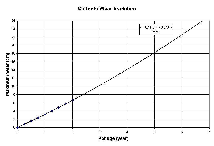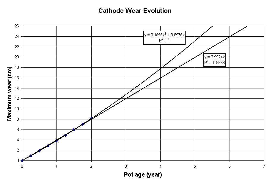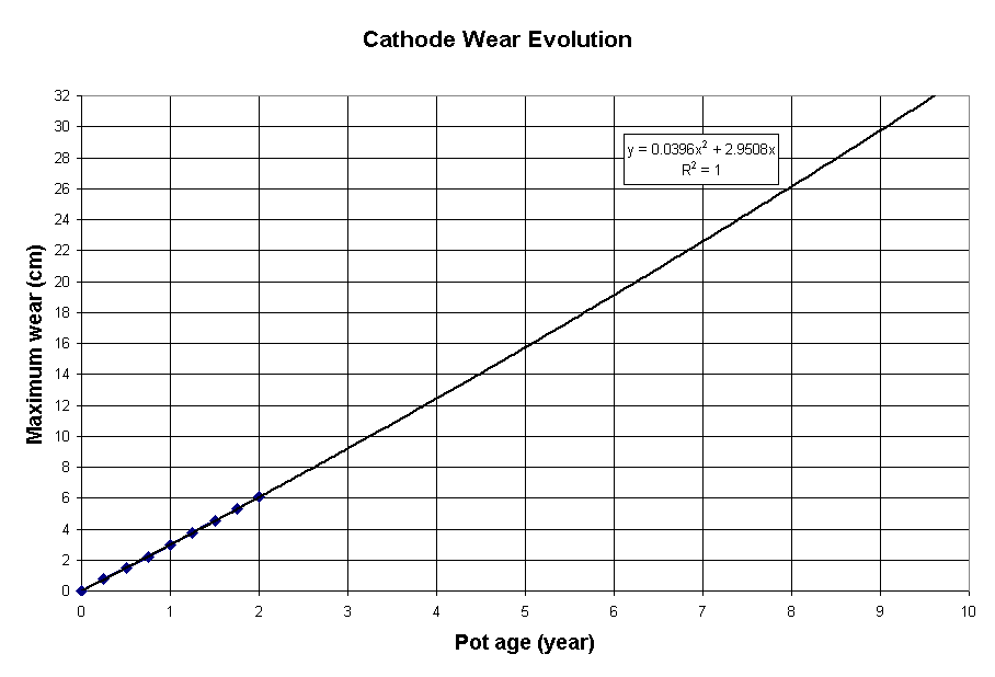 For high amperage cells, graphitized carbon cathode blocks are now the preferred choice because, contrarily to the graphitic blocks, their use prevent the cathodic resistance to increase to catastrophic level with cell age (1). Unfortunately, graphitized cathode blocks are characterized by an increased erosion rate that limits, in current cell designs, the cell life to a maximum of 2500 days (1).