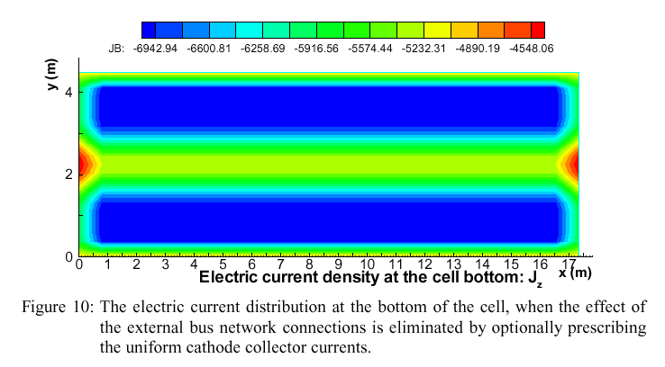 There is an option in the model for the individual collector bar currents to be imposed, for instance taken from measurements for a particular cell in pot-line (for diagnostic purposes). Figure 10 demonstrates the case where equal currents, equal to 500 kA/48, are imposed for each collector. This type of solution corresponds to the thermo-electric model solution without the effect of the bus bar network connections as shown in the Figure 6, which gives more detailed current distribution with finer mesh representations.