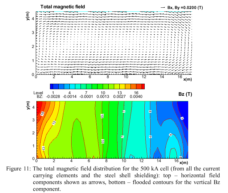 A typical run starts with a flat metal surface. The current distribution and the corresponding magnetic field from all the current-carrying parts of the cell, its neighbors and the return line are computed for this situation. Then the magnetization is computed for the cell steel parts, and the magnetic field additionally corrected by this effect. This total magnetic field distribution for the 500 kA cell is shown in Figure 11. The obtained electromagnetic force distribution permits now to compute the liquid aluminium surface deformation, shown in Figure 12, which we will call the 'assumed stationary interface' (a stationary MHD model would stop at this). Actually, the electric current needs to re-adjust to the new ACD distribution in the cell. The transient adjustment takes some time (200-300 s). If the cell would be ideally stable, we will achieve a stationary interface position and a corresponding current distribution. However, in a real cell the wave damping is complicated by the presence of the predominantly horizontal re-circulating fluid flow.