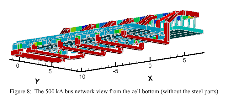 After the input of the cell data and the bus network in a specially designed compact 'table file', the bus network can be visualized in a 3-d view using the widely used commercial package Tecplot. Adding connections, changing bus locations and cross-sections is quite easy, giving the freedom to experiment and optimize the network. The bus arrangement for the presently investigated 500 kA cell and the steel shell are shown in Figure 7. The on-screen view can be arbitrary rotated, shifted and zoomed-in to inspect the details, as in Figure 8 showing a bottom view for the cell. The currents, their time dependent deviations from a stationary state and the temperature of the bars can be shown in color at different time moments.