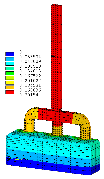 On retrouve à la figure 12 le maillage du modèle de tranche de cathode, les différentes couleurs représentant les différents types de matériaux.