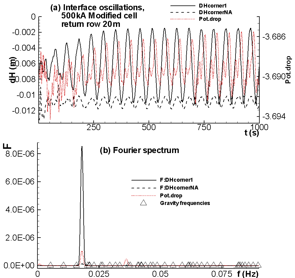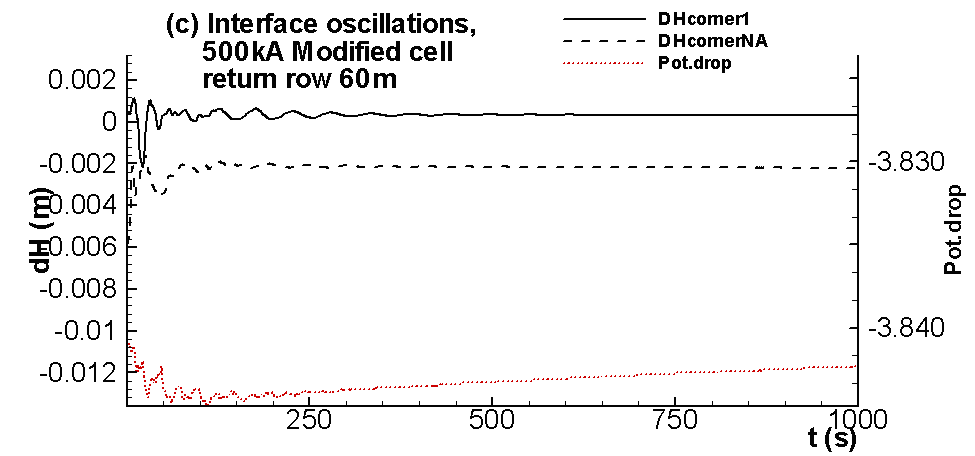 Figure 9: Electric current distribution in the liquid metal computed with the MHD model and the ledge position input from the Thermoelectric model: arrows show the horizontal depth averaged current, contour levels - vertical current on the bottom from the top view point. The electromagnetically self-sustained wave and voltage oscillation pattern for the cell is a measure for the cell operation stability. Typically almost all commercial cells even of low amperage 80-100 kA exhibit some rolling wave noise which we can detect also with the present MHD simulation package. Our experience with commercial cell modeling showed the presence of this sustained noise in almost all cell types even at low levels. The present 'Modified' 500kA cell shows relatively low amplitude signal (Figure 10 a,b) at a well defined frequency about 0.017 Hz, which is between 3rd and 4th gravitational self frequencies for this cell. However, a very remarkable result is achieved when moving the return current line to 60 m - the oscillation is completely damped out (Figure 10 c). Therefore we could expect that this cell will be a very good candidate for a commercial implementation, at least from the point of view of the MHD. The initial 'New' cell design was far from this very stable condition, as can be seen from Figure 10 d. Note, also the predicted voltage oscillation detectable from this model, and which can not be detected by the many other MHD models. A 'stationary' interface shape in practice is never achieved, because the real cells operate in transient regimes. Even the MHD rolling wave noise is quite typical for many cells. The 'New' 500 kA cell shows quite considerable wave pattern and the Figure 11a presents the interface shape at a particular time moment 500 s from the simulation start. Clearly the 'Modified' version of the cell has much better interface shape of lower amplitude (Figure 11b). Here the small humps and depressions are created by the pressure differences in the two layers owing to the difference in the turbulent large scale recirculation patterns. When the return current line was moved to 60 m distance, the interface can achieve a shape which is practically stationary and of very little deformation as shown in the Figure 11c. The horizontal velocity field is not damped, as shown in Figure 12, even for the stable 'Modified' cell. However, the turbulent average velocity pattern is relatively symmetric and it is very similar both in the liquid metal and the electrolyte, therefore the horizontal flow generated pressure distribution is also well compensated at the interface and no significant additional deformation is created for the stable cell. |