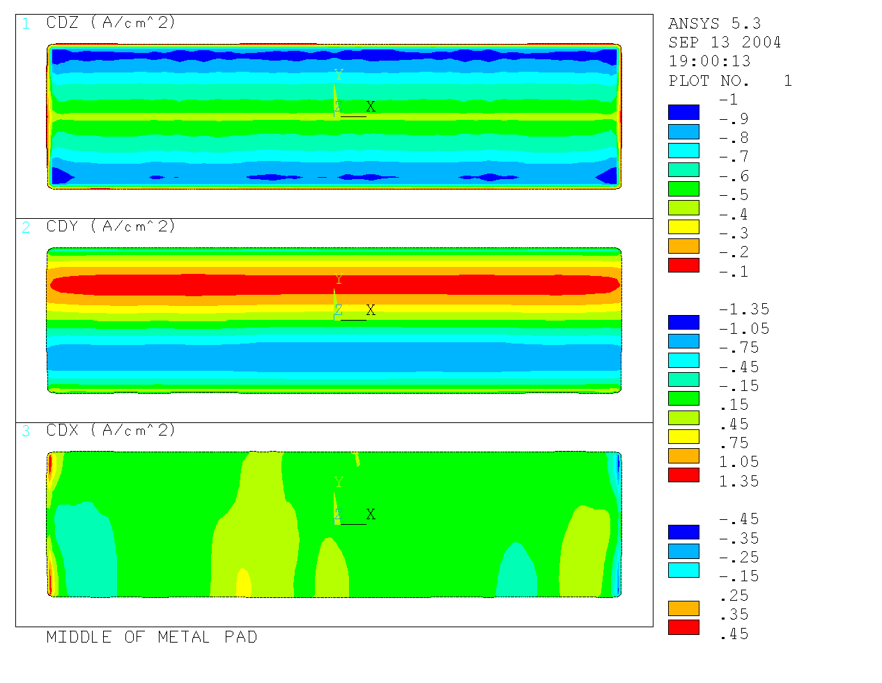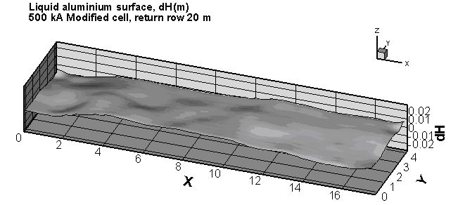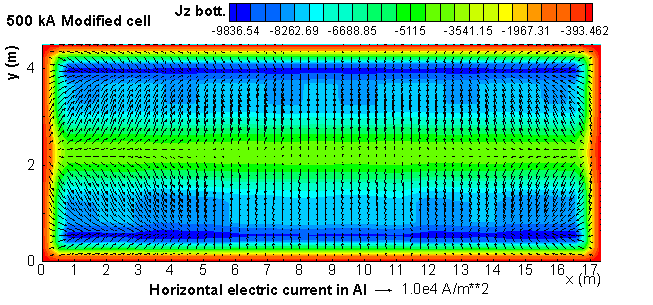 Figure 6: Current density in the metal pad of the 3D full cell and external bus-bar thermo-electric 500 kA cell model. MHD model The MHD model of the transient fluid flow coupled to the electromagnetic field at all times [2, 3] has been upgraded to include the ledge toe shape on the bottom input from the thermoelectric model. This means that a significant change in the electric current distribution occurs in the liquid metal, which in turn affects the turbulent velocity field and the cell stability. The cell stability is determined by directly computing the metal-electrolyte interface wave development accounting for the full velocity field and electromagnetic field adjustment at each very small computational time step, typically 0.1-0.25 s for the 500kA cell test runs. A typical run extends to 1000 s of the physical time which is sufficient to achieve a well established wave and flow pattern. |