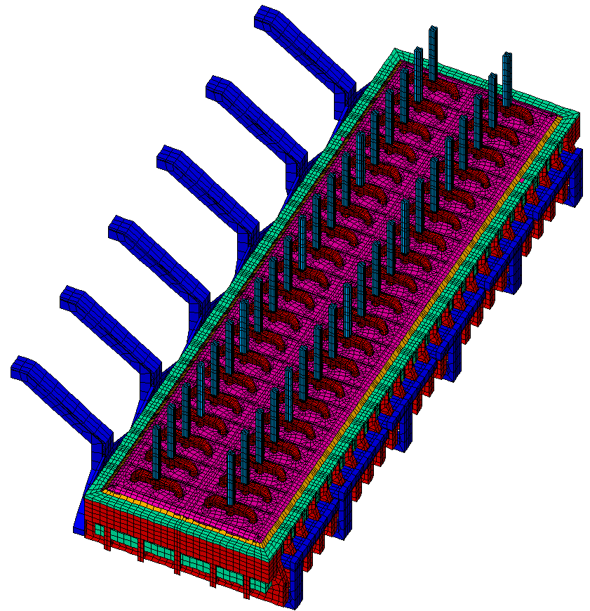 Figure 4: . Coarser mesh of the 3D full cell and external bus-bar thermo-electric 500 kA cell model. The P4 computer took "only" 40.6 CPU hours to solve the model 6 times (i.e. the initial solution plus 5 loops of the ledge profile geometry convergence scheme, see figure 5 for the thermal solution). Figure 6 presents the computed current density in the metal pad. |