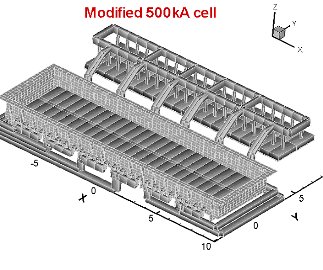 More work has been done to optimize the bus-bar arrangement for our 'New' 500 kA cell [2], which actually was only marginally stable and not suitable for practical industrial implementation. The current carrying bus arrangement is shown in Figure 7 together with the steel parts used in the present simulations. The same figure (bottom part) shows the modified bus arrangement which ensures significant reduction of the overall magnetic field, especially the vertical Bz component. Figure 8 demonstrates the comparisons with the previous cell ('New') and the 'Modified' cell total magnetic fields. For such a high amperage cell (500 kA) the magnetic field is well compensated for the 'Modified' cell, the average magnitude of the vertical field being about 0.0012 T. It needs to be mentioned that the parallel row of the cells carrying the return current is positioned very close at 20 m free space between the rows. If this space is increased to 60 m, the vertical field average magnitude is reduced to 0.0008 T which brings the cell in a very favorable MHD regime when even the theoretical stability limits are satisfied.