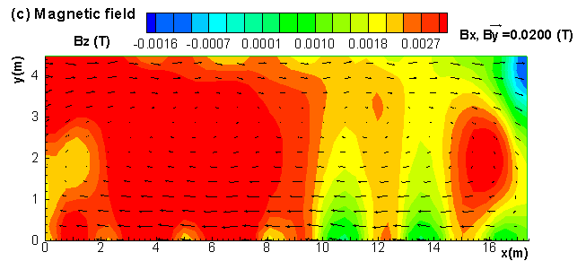 Figure 8: Magnetic field distribution for the 500 kA cell: (a) 'Modfied', return row of cells at 20 m (Bmax= 0.0039 T), (b) 'Modified', return row at 60 m (Bmax= 0.0032 T), (c) for previous design cells (Bmax= 0.0053 T). The bus arrangement and their cross-sections were additionally optimized also for the electric current distribution uniformity over the cathode collectors, including the 50:50 split for the upstream and downstream currents. The current distribution in the liquid aluminium is shown in the Figure 9, where the ledge toe profile can be seen as input from the coupled thermoelectric model. |