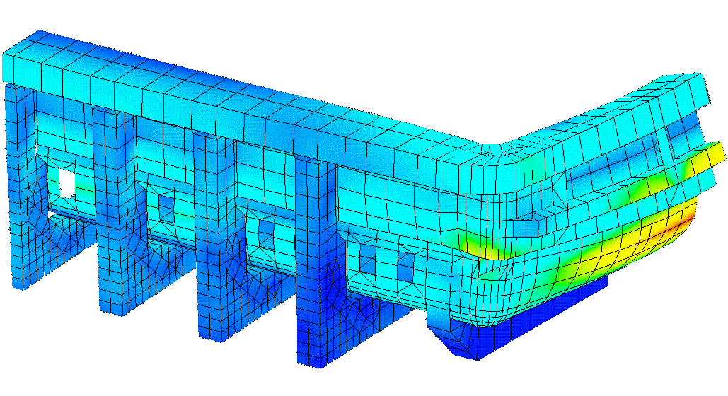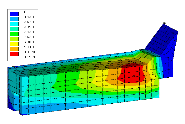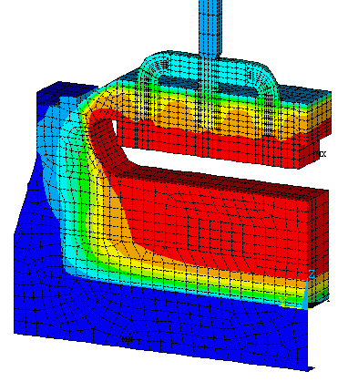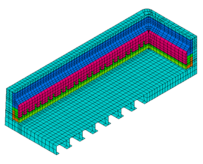 The requirements for that type of model were quite different from those of the thermo-electric models. The full quarter of the shell structure had to be meshed and that mesh had to be fine enough to be able to accurately compute the level of stress in the potshell structure. Obviously, 2D shell plastic mechanical elements were used, initially only the triangular shape was available! Providing an accurate thermal loading on the potshell structure was a difficulty as no quarter thermo-electric models were available.