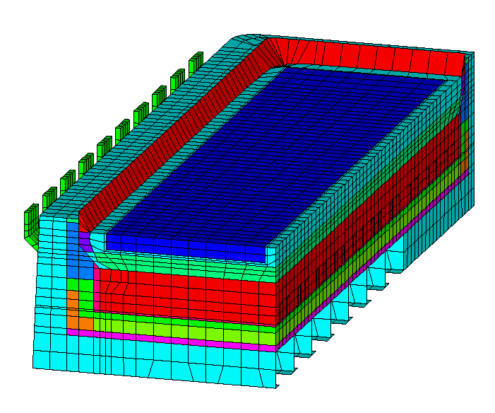 The 2D+ model uses beam elements to represent geometric features lying in the third dimension (the + in the 2D+ model). Even that way, some geometric representation accuracy is of course lost compared to a true 3D model, but on the other hand, the payback is almost an order of magnitude gain on the model usage turn around time (Reference 1, see figure 10). That type of speedup becomes very important in the context of the utilization of that kind of model in transient mode.