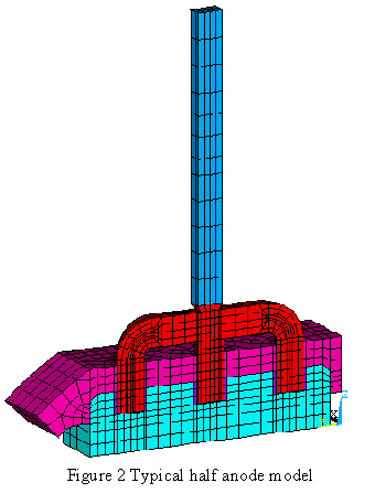 Thermo-electric half anode model The AP30 anode design consists of a prebaked carbon block and a set of three steel studs connected together by a steel yoke. The carbon and the studs are electrically and mechanically joined together by cast iron. The steel yoke is connected to a vertical aluminum rod through a bimetallic joint. Once the new anode is put in operation in the cell, it is covered by a «crust» of mixed alumina powder and crushed frozen electrolyte to form an insulating layer above the anode. Figure 2 displays the finite element mesh of a typical half anode model.