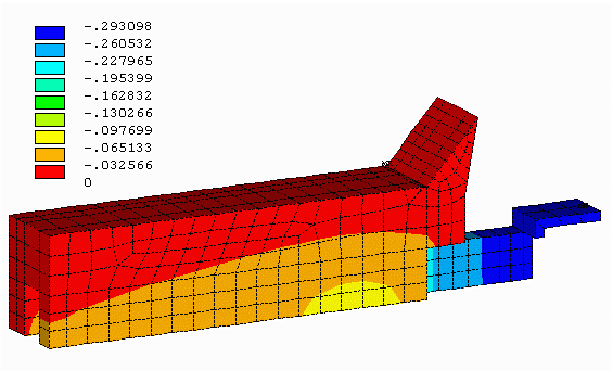 Figure 5: Voltage solution from a typical model And again, the global heat dissipation must be calculated with the use of a user´s macro. Yet this time, the calculation involves the extrapolation of the center section results into the full cathode e.g. it must incorporate into the calculation the effect of the end wall and corner heat losses. This is achieved by asking the user to provide an extrapolation factor to account for those extra losses (see Table 2). This time the greatest modeling challenge involves the calculation as part of the model solution of the thickness of the frozen layer of electrolyte that forms on the internal walls of the cathode. This problem is tackled by another user´s defined macro that performs multiple solutions by iterating between the preprocessing phase and the postprocessing phase until the shape of the ledge layer is compatible with both the melting surface temperature and the melting heat flux boundary conditions [6]. |