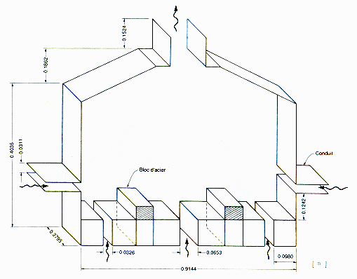 Ces valeurs ont donné la même viscosité turbulente aux entrées que le modèle algébrique. À la sortie de l'enceinte, les gradients de ces trois variables étaient nuls. Ces conditions aux limites n'ont pas causé d'instabilité numérique. Plusieurs chercheurs ont trouvé expérimentalement que la valeur du nombre de Prandtl turbulent de l'air varie entre 0.5 et 1.0, ce qui est voisin de la valeur du nombre de Prandtl laminaire de 0.71. Ces résultats ont justifié la simplification qui veut que ces deux nombres soient égaux. La maquette |