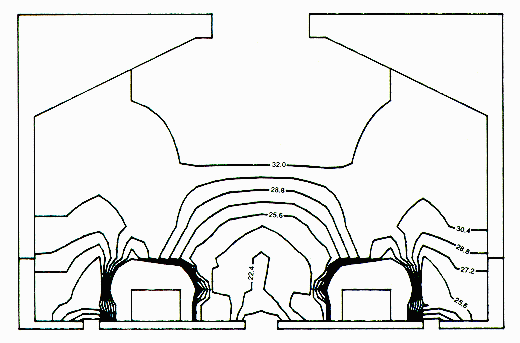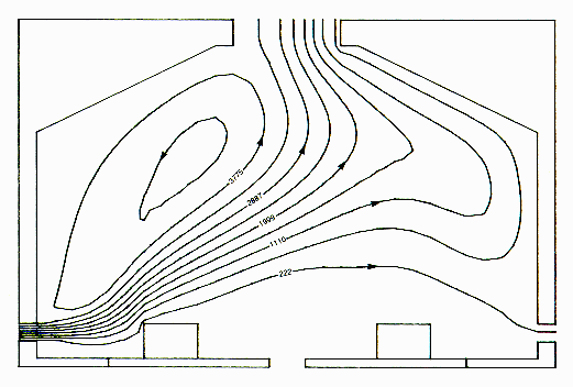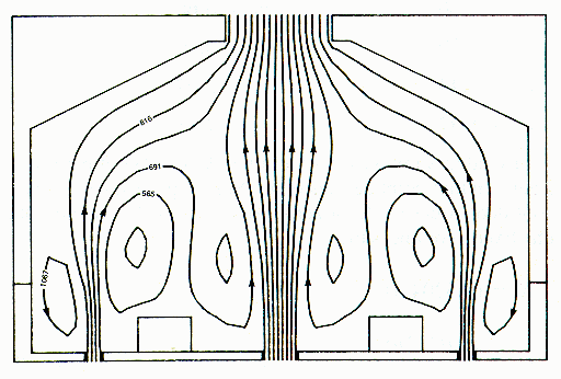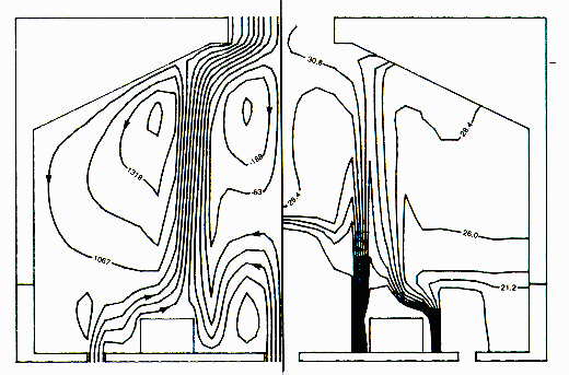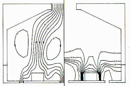 Les résultats expérimentaux sont montrés à la figure 2. Le profil d'écoulement, réalisé qualitativement à partir de d'observation directe des films de la maquette, est en bonne concordance avec les lignes de courant obtenues à partir des lectures de vitesse dans la maquette. Les deux interprétations de l'écoulement mettent en évidence les six boucles de recirculation et les courants descendants au-dessus de chaque cuve. L'écoulement au-dessus des entrées est non-stationnaire tandis que l'écoulement au-dessus des cuves est stationnaire. I1 faut cependant souligner que deux types d'écoulement ont pu être observés près des murs de la maquette. Le premier type, où les jets d'air des entrées latérales moment directement au plafond, a été observé pendant moins d'une heure après le départ de la convection forcée. Après cette période, l'écoulement se transforme irréversiblement et adopte le deuxième type où les jets latéraux s'inclinent vers les murs par l'effet Coanda. Trois simulations ont été réalisées avec le modèle mathématique soient: sans aucun modèle de turbulence, avec le modèle algébrique et avec le modèle K-e . La figure 3 montre les résultats calculés. Sans modèle de turbulence, les trois jets d'air provenant des entrées se dirigent directement au plafond et les recirculations au-dessus de chaque cuve sont asymétriques. Le modèle algébrique a amélioré les résultants légèrement et le modèle K-e a simulé presque le même écoulement que celui de la maquette. Une comparaison quantitative entre ces simulations est démontrée au tableau 1.