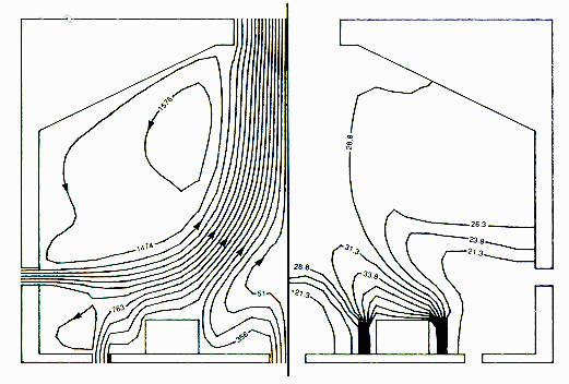 Figure 5 - CAS 2: L'écoulement simulé (partie gauche) et les isothermes simulées (partie droite) a) aucun modèle de turbulence b) modèle algébrique de turbulence c) modèle K-e-G de turbulence Une modification a été apportée au modèle algébrique en ajoutant un terme pour la convection naturelle: