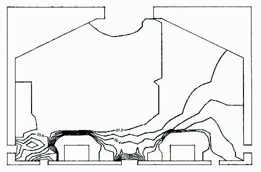 Cette simulation a permis de reproduire les six boucles de recirculation, mais les boucles près des murs étaient toujours trop grandes. Donc, le modèle algébrique a simulé seulement l'écoulement expérimental le moins stable: ceci explique la haute somme des carrés des erreurs. Mais le modèle K-e a réussi à simuler l'effet Coanda et, par conséquence, a réduit la somme des carrés des erreurs. CAS 2: MURS FERMÉS ET CUVES CHAUDES