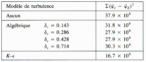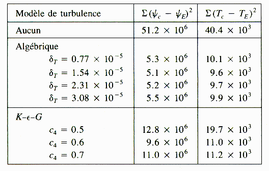 Si les calculs sont faits à partir d'une solution voisine, la différence entre les coûts des modèles de turbulence est réduite d'environ 50%. Étant donné que le coût d'utilisation du modèle différentiel est bien élevé, il semble plus avantageux présentement de faire des simulations industrielles sur des écoulements turbulents avec le modèle algébrique modifié. Même la modélisation de la turbulence par une viscosité constante peut fournir de bons résultats (Markatos et al., 1982). Plusieurs autres travaux de recherches seront nécessaires dans le but de trouver un modèle de turbulence efficace pour la convection mixte (Kurabuchi et Kusuda, 1987).