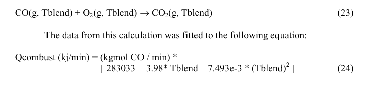 Qcombust, the quantity of heat generated by the combustion of CO as it exits the electrolyte is needed to calculate Tmix. Qcombust is obtained by calculating the enthalpy of the reaction: