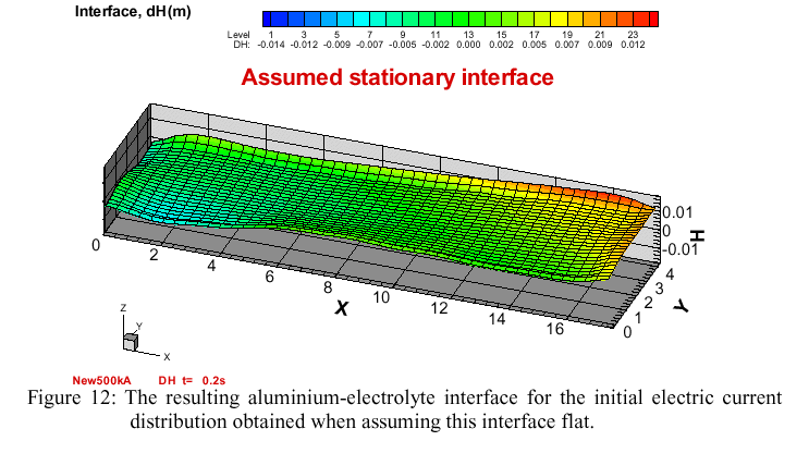 However, the flow is just quasi-stationary, because the interface wave is maintained by the inertia and the continuous electric current adjustment as opposed to the turbulent friction damping. The MHD model is designed to simulate this behavior and to determine if the particular cell under investigation will remain stable, the oscillation will be damped to a very small amplitude level (quite often detectable in careful measurements of the anodic current fluctuations). If the cell is not correctly designed, the interface wave continues to grow and the cell is unstable. For instance, the present 500 kA cell with a symmetric bus network (without the return line magnetic compensation) will be unstable and not suitable for operation.