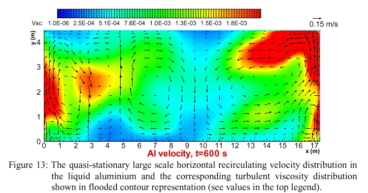 The velocity fields both in aluminium and the electrolyte reach a more or less stationary state, which for the aluminium case is shown in Figure 13. The highly non-uniform distribution of the effective turbulent viscosity is shown by the color flooded contour lines. The regions of high turbulent viscosity mean also a highly increased heat and mass transport for these vicinities, which is important when predicting the thermal losses and the cell wall erosion.