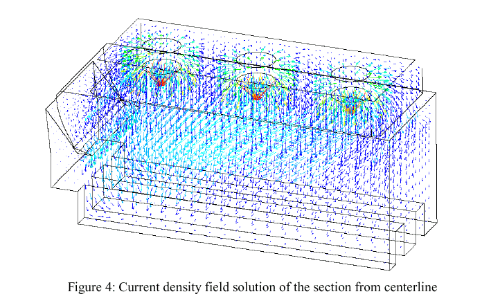 The next phase of 3D thermo-electric model development would be the full cell half with busbar model [4]. On its own, the busbar design already involves both the MHD and thermo-electrical models as the busbar layout is dictated by MHD cell stability model results, yet the busbar sizing is done using a thermo-electric model. By adding the busbar thermo-electric model to a full cell half thermo-electric model we can analyze the impact of an imperfectly balanced busbar on the metal pad current density (assuming that the busbar is symmetric).