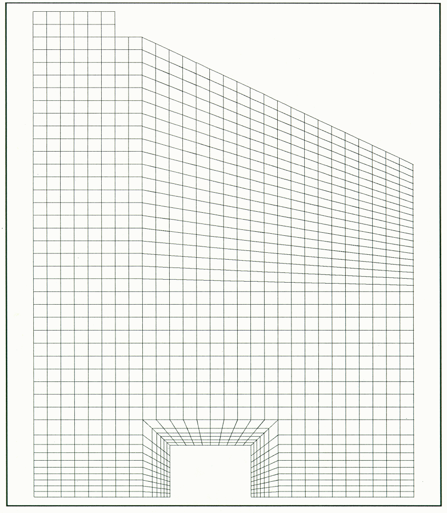 The mathematical model simulated the flow and temperature inside a physical model of a cell room of an aluminum smelter. The grid layout for the mathematical model is shown in Figure l representing one half of the cell room model. Eighteen blocks were used to define the cell room geometry. In order to improve the accuracy of the convection patterns near the heat source, denser meshing was used around the rectangular block, which represented the electrolytic cell. There were two inlet openings in the floor, one inlet opening in the sidewall and one outlet opening in the roof. Three different ventilation arrangements were tested and compared to experimental data.