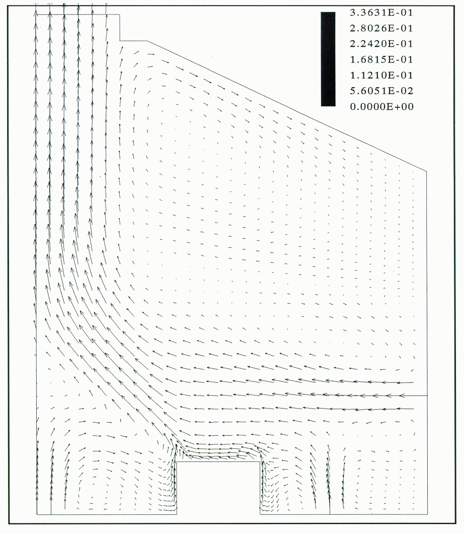 In this case the effect of wind was simulated by increasing the flow through the sidewall opening on the left side of the building model. The flow in the entire cell room was simulated, since the flow pattern was no longer symmetric with respect to the centerline. The experimental data showed that the thermal plume above the cell model on the left was flattened and the thermal plume above the cell model on the right was inclined towards the right (Figure 8). A large recirculating loop existed under the roof. The isotherms indicated a cool zone of 29 °C on the left side of the building and a warm zone of 34 °C on the right side of the building.