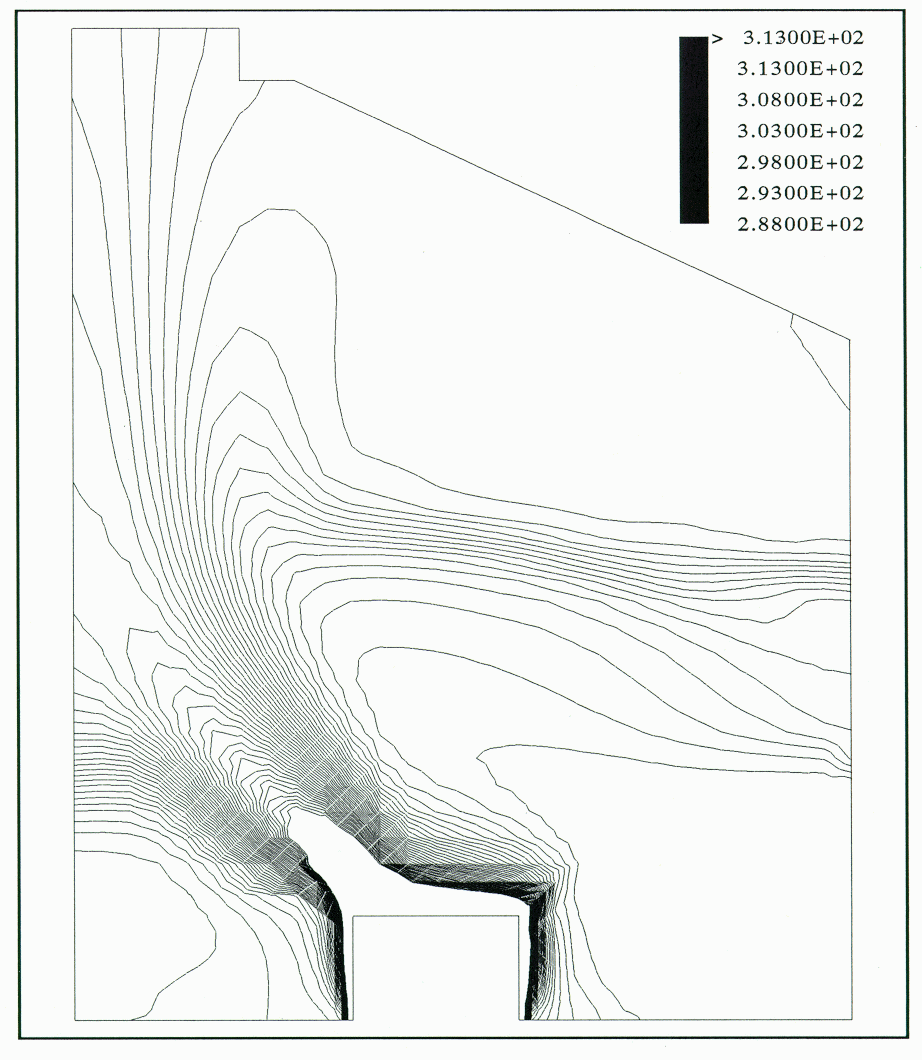 With the K-E turbulence model the flow pattern was similar to that observed in the physical model (Figure 6). However, the influence of the flow from the sidewall was overpredicted, since the thermal plume was pushed too much towards the center of the building. The isotherms show a narrow plume inclined at 45 ° and at a high temperature of 40 °C.