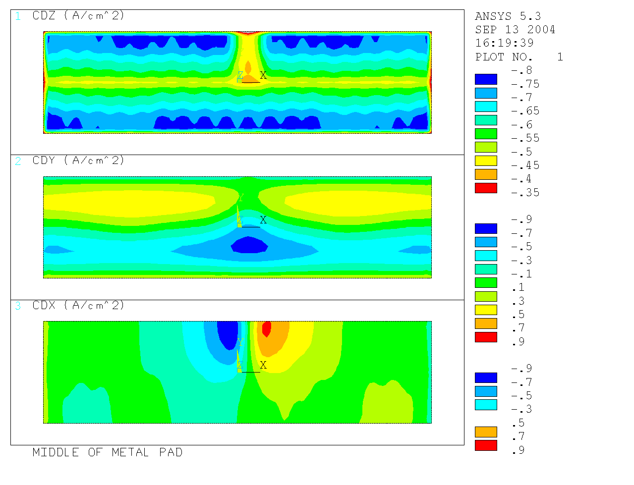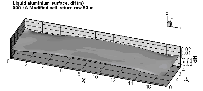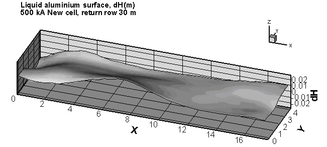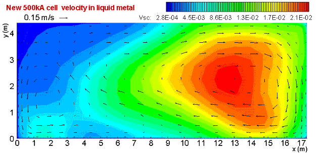 Figure 6: Current density in the metal pad of the 3D full cell and external bus-bar thermo-electric 500 kA cell model. MHD model The MHD model of the transient fluid flow coupled to the electromagnetic field at all times [2, 3] has been upgraded to include the ledge toe shape on the bottom input from the thermoelectric model. This means that a significant change in the electric current distribution occurs in the liquid metal, which in turn affects the turbulent velocity field and the cell stability. The cell stability is determined by directly computing the metal-electrolyte interface wave development accounting for the full velocity field and electromagnetic field adjustment at each very small computational time step, typically 0.1-0.25 s for the 500kA cell test runs. A typical run extends to 1000 s of the physical time which is sufficient to achieve a well established wave and flow pattern. |