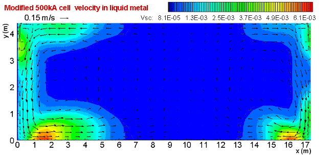 Figure 9: Electric current distribution in the liquid metal computed with the MHD model and the ledge position input from the Thermoelectric model: arrows show the horizontal depth averaged current, contour levels - vertical current on the bottom from the top view point. The electromagnetically self-sustained wave and voltage oscillation pattern for the cell is a measure for the cell operation stability. Typically almost all commercial cells even of low amperage 80-100 kA exhibit some rolling wave noise which we can detect also with the present MHD simulation package. Our experience with commercial cell modeling showed the presence of this sustained noise in almost all cell types even at low levels. The present 'Modified' 500kA cell shows relatively low amplitude signal (Figure 10 a,b) at a well defined frequency about 0.017 Hz, which is between 3rd and 4th gravitational self frequencies for this cell. However, a very remarkable result is achieved when moving the return current line to 60 m - the oscillation is completely damped out (Figure 10 c). Therefore we could expect that this cell will be a very good candidate for a commercial implementation, at least from the point of view of the MHD. The initial 'New' cell design was far from this very stable condition, as can be seen from Figure 10 d. Note, also the predicted voltage oscillation detectable from this model, and which can not be detected by the many other MHD models. A 'stationary' interface shape in practice is never achieved, because the real cells operate in transient regimes. Even the MHD rolling wave noise is quite typical for many cells. The 'New' 500 kA cell shows quite considerable wave pattern and the Figure 11a presents the interface shape at a particular time moment 500 s from the simulation start. Clearly the 'Modified' version of the cell has much better interface shape of lower amplitude (Figure 11b). Here the small humps and depressions are created by the pressure differences in the two layers owing to the difference in the turbulent large scale recirculation patterns. When the return current line was moved to 60 m distance, the interface can achieve a shape which is practically stationary and of very little deformation as shown in the Figure 11c. The horizontal velocity field is not damped, as shown in Figure 12, even for the stable 'Modified' cell. However, the turbulent average velocity pattern is relatively symmetric and it is very similar both in the liquid metal and the electrolyte, therefore the horizontal flow generated pressure distribution is also well compensated at the interface and no significant additional deformation is created for the stable cell. |