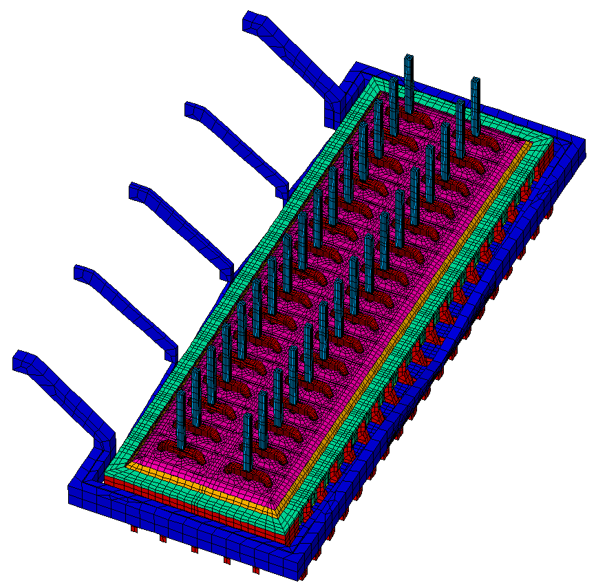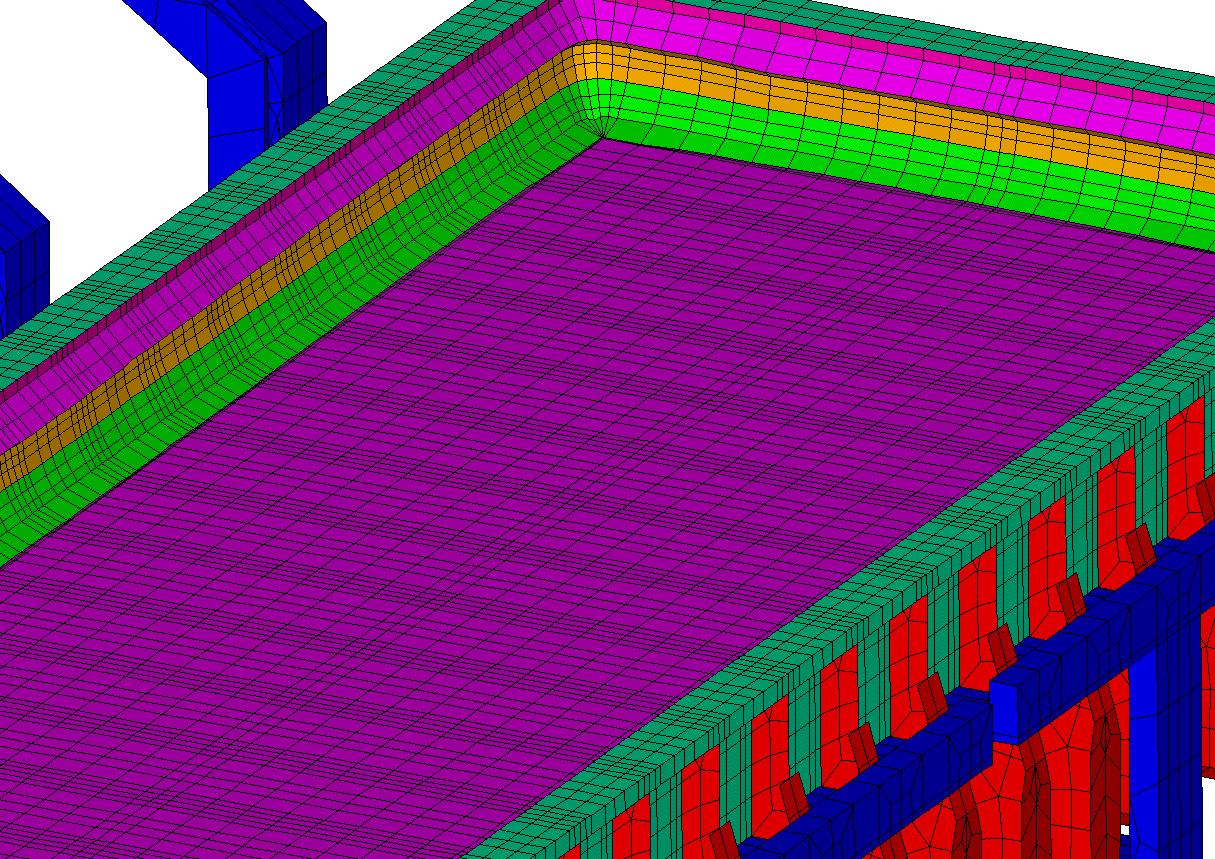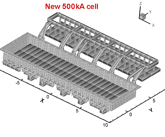 3D full cell and external bus-bar thermo-electric model of the 500 kA demonstration model The above first successful solution of a 3D full cell and external bus-bar model revealed that the iterative solver, required to solve such big models, is very sensitive to the problem setup. As example, electric boundary conditions can be imposed in many valid ways, but there are ways that will lead to a faster convergence. It was also discovered that the simple fact of cutting one flexible decreased drastically the convergence rate of the iterative solver. This experience was put to use when it was time to try to solve once again the 500 kA demonstration cell model. This time a coarser mesh of 329,288 elements was built (see figure 4) and a more robust set of electric boundary conditions was used. With that setup, it was finally possible to successfully solve the model.