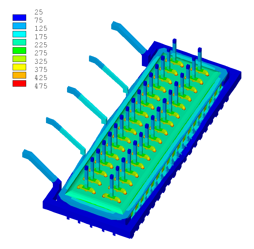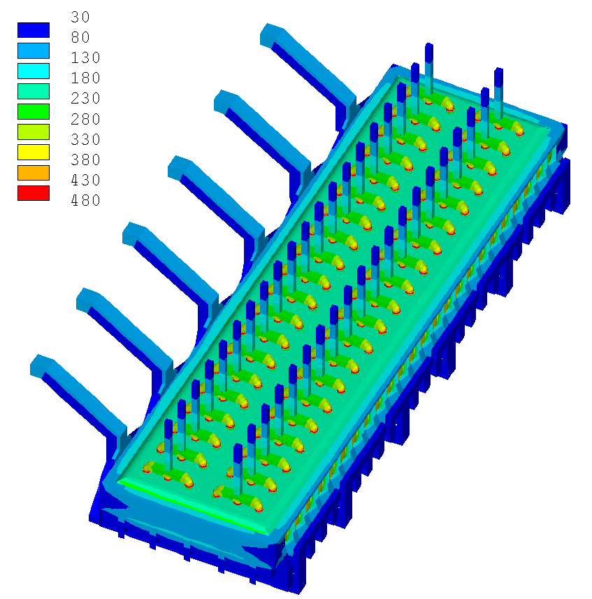 Figure 2: Thermal solution of the 3D full cell and external bus-bar thermo-electric 300 kA cell model. Because of the bus-bar symmetry, one cathode flexible was cut off in order to ensure a non-symmetric solution. That flexible is located near the front side, back side centerline of the cell on the negative or downstream side. Figure 3 presents the resulting metal pad current density.