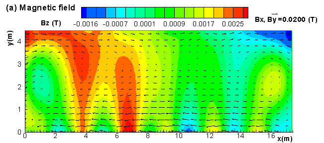An additional upgrade was made to the MHD model by including the ferromagnetics model directly in the full MHD simulation package. There is no need any more to run a separate ferromagnetics program in order to account for the effect of the steel parts magnetization. Instead the present model constantly updates the magnetic field with the magnetization effects by using a fast converging iterative magnetic field solver. This solver has no limit on the ferromagnetic element number dictated by the computer memory restrictions because the influence matrix is not stored. The nested iteration procedure is implemented in such a way that convergence for non-linear material properties and the element mutual interaction is achieved in few iterations. The initial step convergence also is relatively fast (typically in less than 100 iterations). The user of the MHD program package can input the whole steel parts (plates) and the magnetization curve (either measured for the specific materials or taken from the literature). In the present runs we used about 3500 steel elements, and tests with 10 000 elements confirmed no significant change.