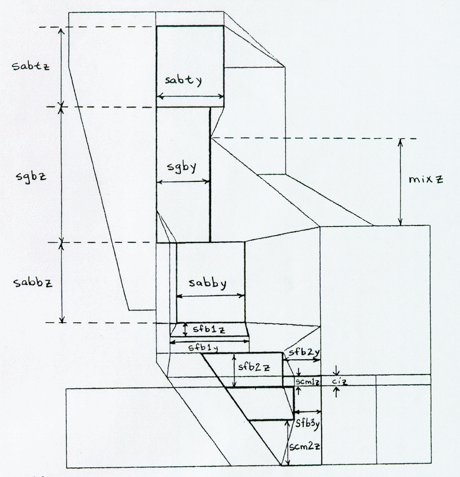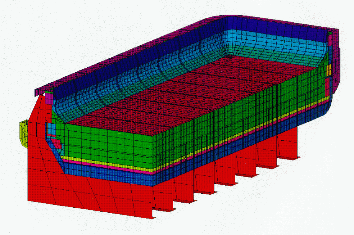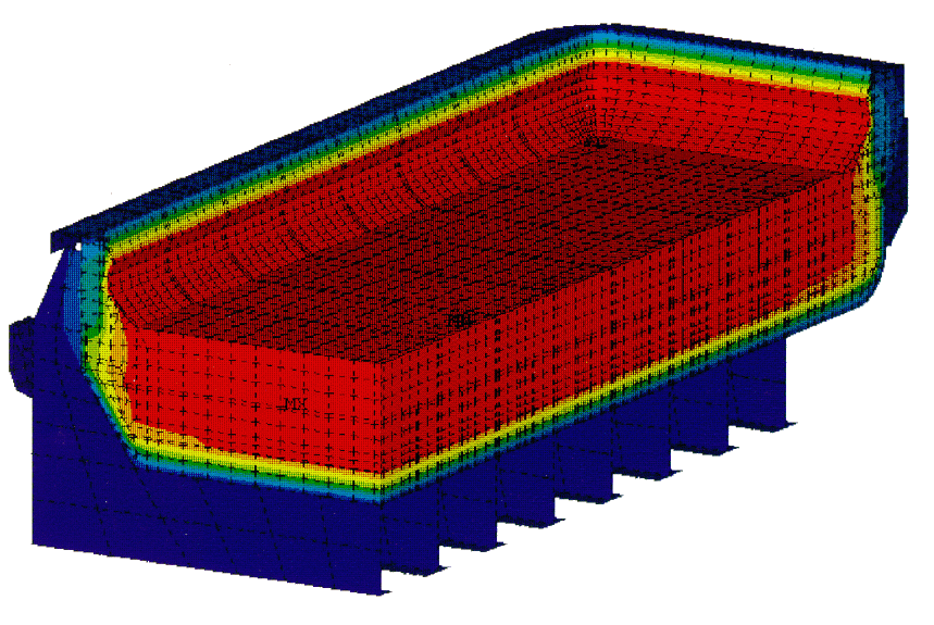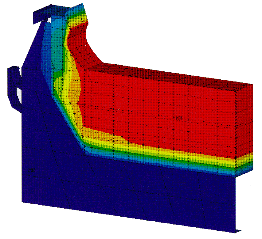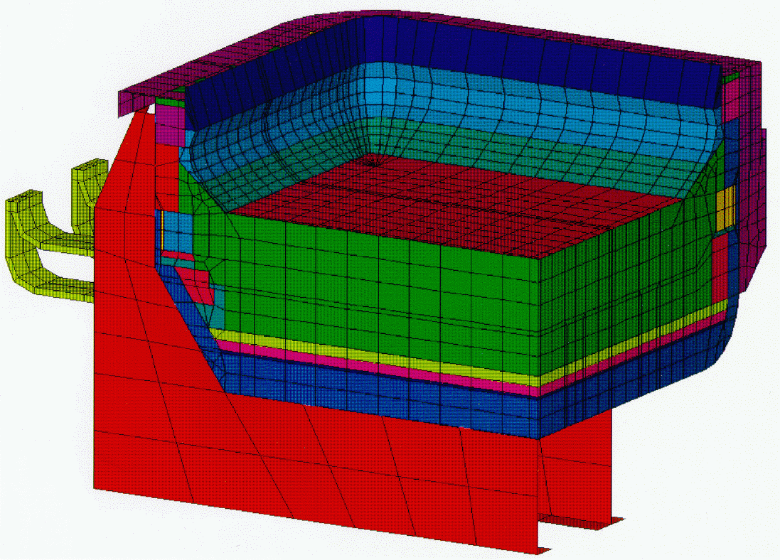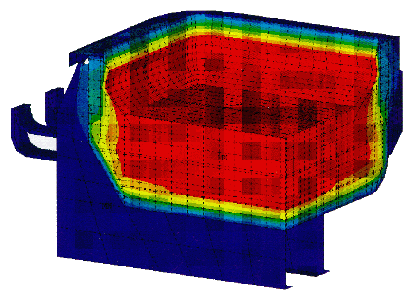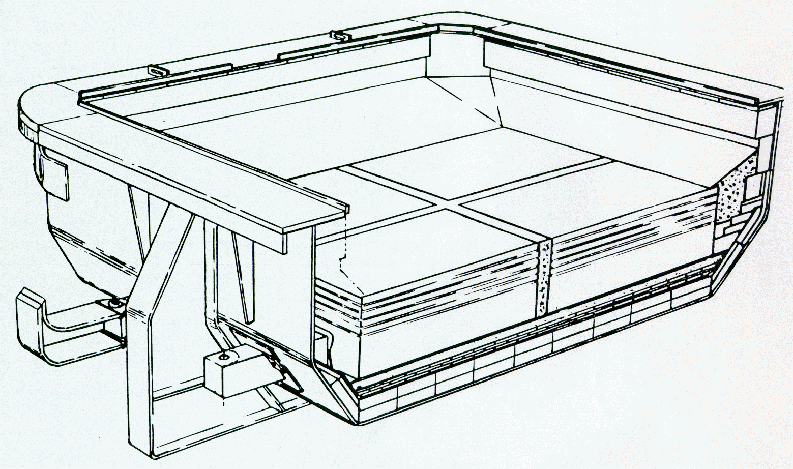 Figure 1: Grande-Baie Smelter Cathode Shell and Lining Design The geometric symmetry of the cell made it possible to model but a quarter of the cathode. The model consists of 21387 elements (Figure2). The geometry of the shell and lining was completely and uniquely represented by 109 independent size parameters Figure 3). Furthermore, 25 materials were used, each of which was defined with non-linear, temperature dependent properties. Heat loss to the environment by convection and radiation was represented using convection |