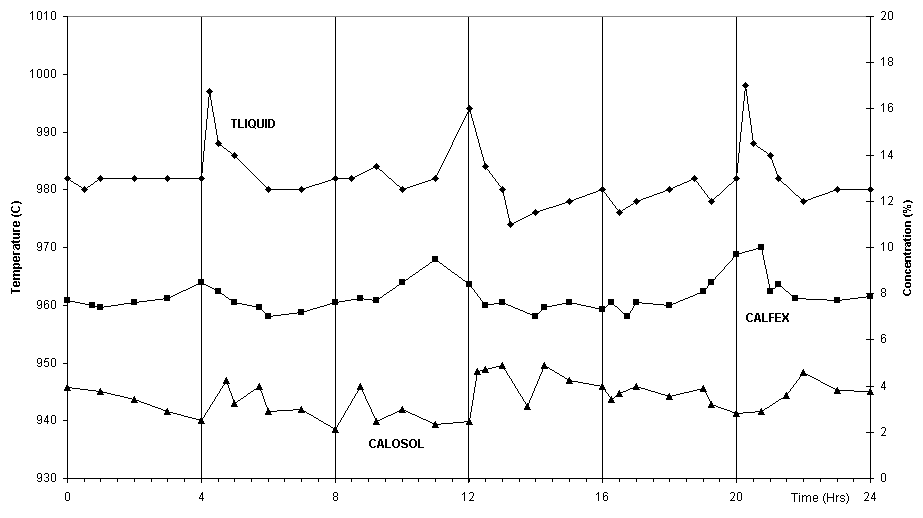 As can be seen in figures 1 and 2, the data obtained is very consistent, showing that the process was well under control during the measurements and that the experimental sampling errors were minimized. Furthermore, the measured behavior compares favorably with the above operational characteristics with the exception of the anode effect frequency. Pot A had 3 anode effects that day while pot B had 4. This discrepancy indicates that the target average break feed of 125 kg was not achieved consistently (other less probable reasons could be poor alumina dissolution or higher current efficiency).