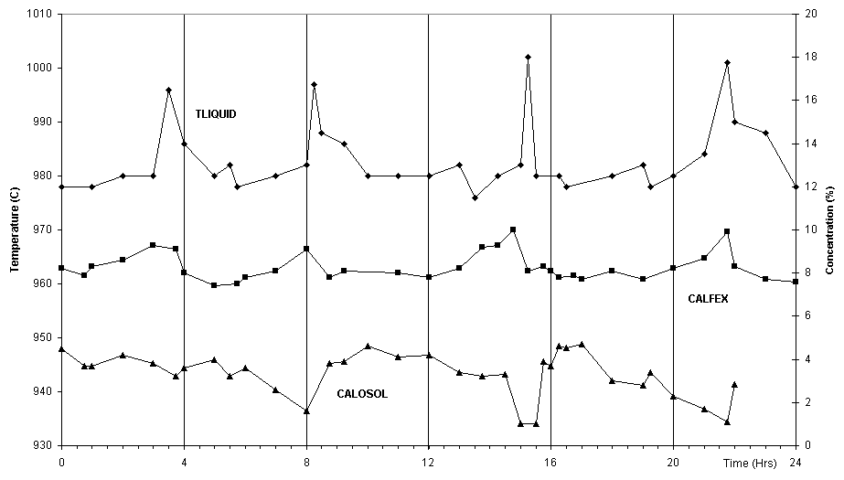 Figure 3: Calculated bath temperature (TLIQUID), concentration of dissolved Al2O3 (CALOSOL) and concentration of excess AIF3 (CALFEX). Comparison of the Measured and Calculated Response Having presented the measured and calculated results, we can compare more closely the two dynamic responses. Given the randomness of the anode effect occurrences observed in the measured data, we will restrict the comparison to one set of measurements (Pot A) for a 24 hour simulation period. Figure 4 clearly demonstrates that the model reproduces every feature of the measured dynamic evolution of the bath temperature, namely