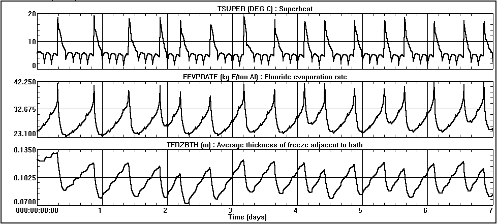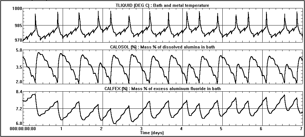 Starting from the steady state solution and using the typical operational characteristics, the transient solution was obtained. A two minute time step was selected resulting in 5040 time steps required to simulate a seven day period. It took 40 seconds on a 486 DX2 PC to calculate the solution. The time history of the measured variables is reported in figure 3. We can see that the predicted dynamic behavior is characterized by a 12 hour anode effect cycle which is a natural outcome of the selected feeding strategy. Additional information was available from the solution as described below.